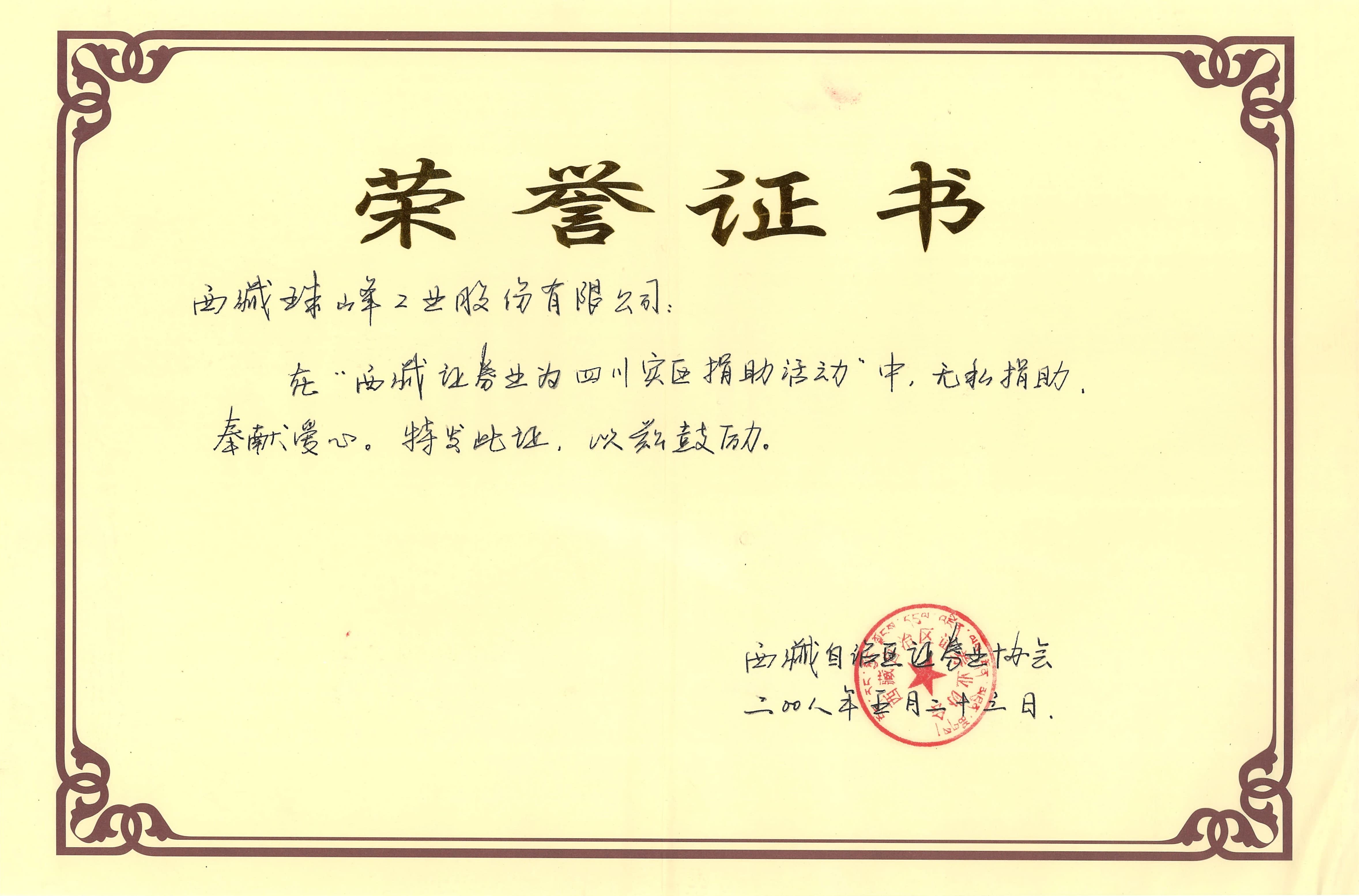 四川災(zāi)區(qū)捐助活動榮譽(yù)證書